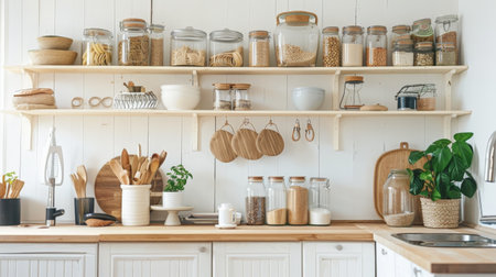 a modern kitchen with an orderly pantry filled with canned goods and dry ingredients, promoting a concept of healthy eating with a minimalist design