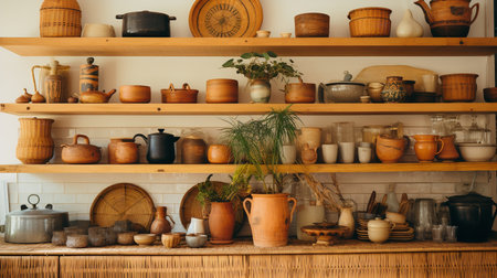 A cozy kitchen scene featuring a wooden shelf filled with various cookware and utensils. Perfect for illustrating modern culinary lifestyle and home decor.