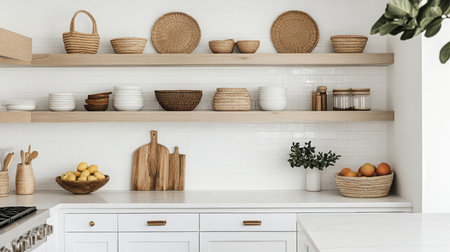 Stylish kitchen shelves adorned with woven baskets and fresh fruits in modern home setting