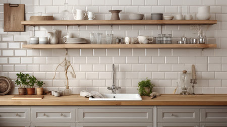 A clean and tidy kitchen with white countertops, wooden shelves, and surrounding space available for text, design, or promotional content.