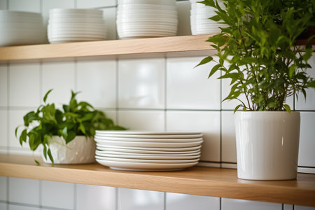 Clean white ceramic dishes stacked on light wooden shelf in modern kitchen