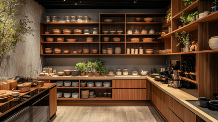 This kitchen features wooden open shelves filled with an array of pots, bowls, and plants, creating a warm and inviting atmosphere ideal for cooking and gatherings.