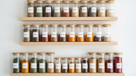An overhead shot reveals neatly arranged glass jars filled with various spices, displayed on wooden shelves against a white wall. The composition highlights the diversity of colors and textures within the jars, suggesting a well-organized kitchen or pantry. Suitable for culinary, food, or lifestyle publications and projects.