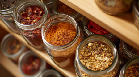 A top-down view of a spice rack featuring jars of chili powder, dried chili flakes, and other seasonings, organized in a clean kitchen setting