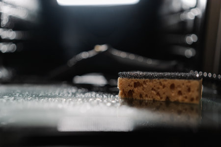 Close-up selective focus shot of steam cleaner and sponge resting on inner glass of gas oven door during cleaning process, with glistening water droplets accentuating surface, nobody, no people.