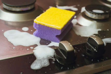 Violet - yellow sponge with a metal gas stove. Cleaning the dirt with a sponge with foam. Cleaning concept