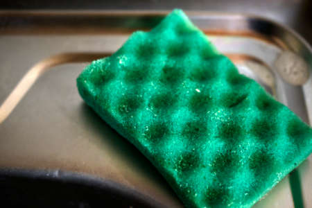 Green sponge for washing dishes in the kitchen