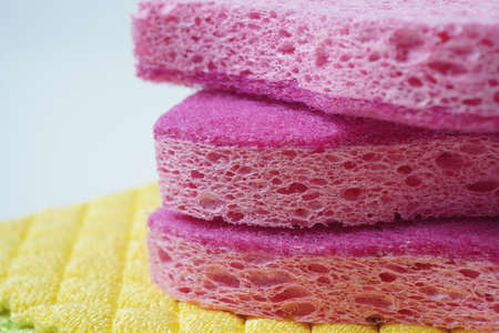 Sponges - close-up. Household cleaning concept. Colorful orange pink yellow sponges on pink background, soft focus, copy text.