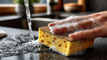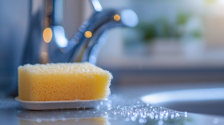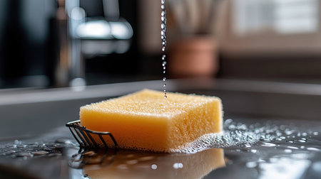 A vivid close-up image showcasing a yellow dishwashing sponge, under running water, creating shiny bubbles in a cozy kitchen setting. Ideal for cleaning themes.