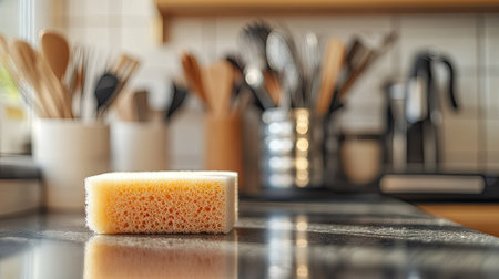 A sleek kitchen scene featuring a sponge and a stainless steel soap dispenser on a countertop. Perfect for depicting cleaning routines and household hygiene.