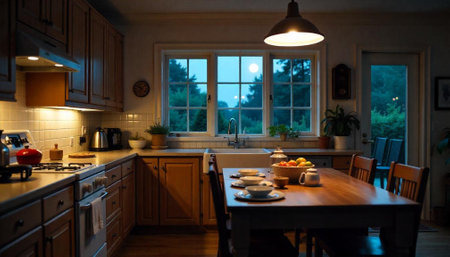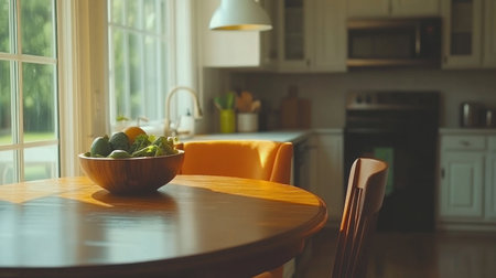 Bright and inviting kitchen features fresh groceries on the table, showcasing a warm natural light that creates a comforting family ambiance in the afternoon.