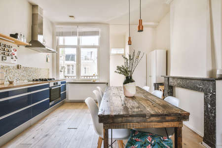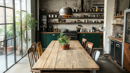 Cozy wooden dining table in modern kitchen with natural light and indoor plants