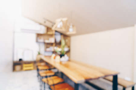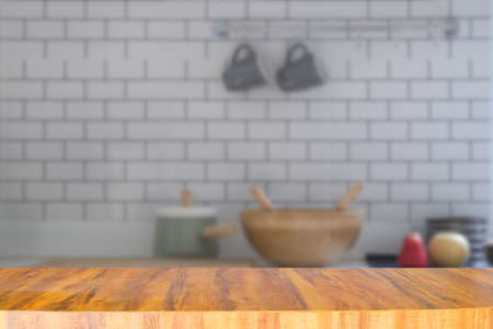 Empty long modern wooden counter on top for placing items and anything on blurred kitchen room background