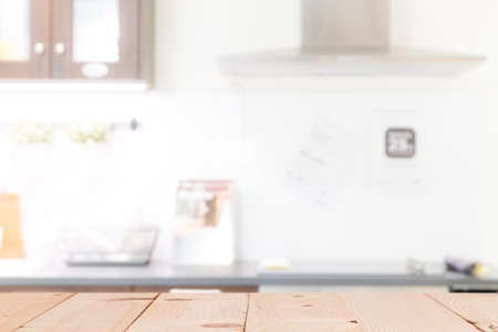 Wood table top (or kitchen island) on blur kitchen interior background - can be used for display or montage your products