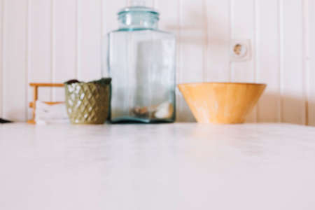 Coastal style white blank empty space kitchen countertop with kitchen utensils and indoor plant, Scandi interior design, AI generated