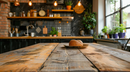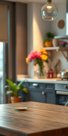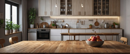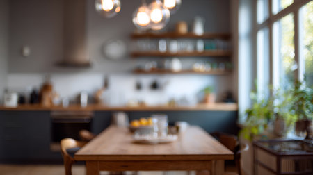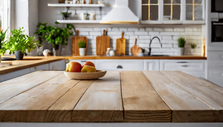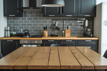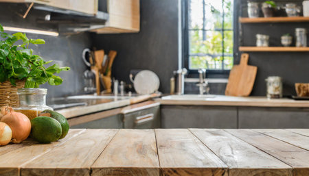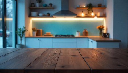Stylish wooden tabletop in a blurred kitchen setting for a cozy cooking atmosphere