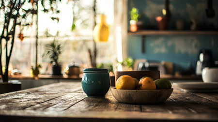 Rustic kitchen setup with a wooden table, a ceramic jar, and a bowl of fresh citrus fruits, bathed in soft natural light and cozy atmosphere.