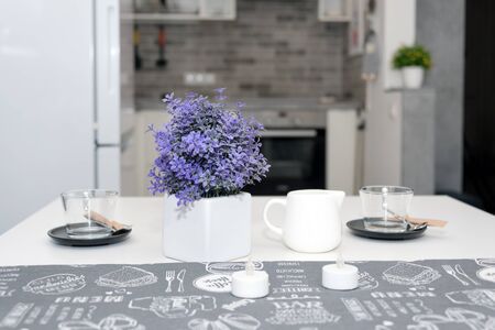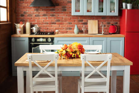 Beautiful table setting in modern kitchen. Space for text. Interior design