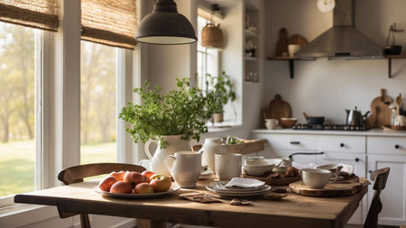 A cozy kitchen scene featuring a rustic wooden table set with vintage dishware, bathed in warm sunlight streaming through a large window, creating a serene atmosphere.