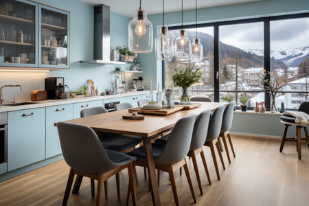 a large kitchen with contemporary interior design. beauty of a wooden table and chic chairs that give the home character