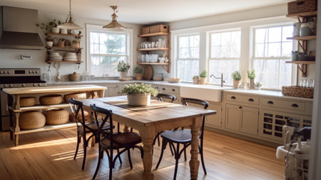 Interior design inspiration of Farmhouse Cottage style home dining room loveliness decorated with Wood and Stone material and Kitchen Island .Generative AI home interior design .