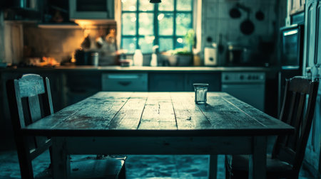 A rustic kitchen table with an empty glass sits in soft natural light, creating a peaceful atmosphere. The warm wooden texture and the inviting space embody simplicity and comfort.