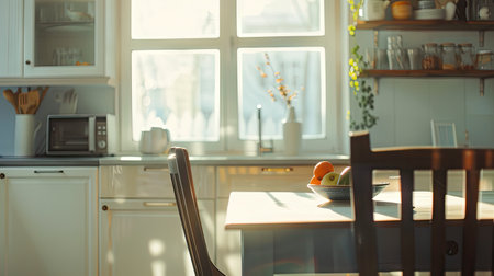 Bright and inviting kitchen with fresh flowers and a cozy atmosphere in a modern home setting