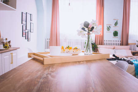 Modern flat with kitchen and living room, open space interior in Scandinavian style with light furniture. Empty coffee cups and flowers. Real photo.