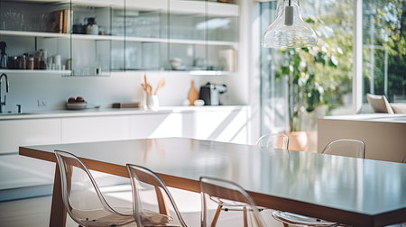 Background of a beautiful and bright kitchen with a minimalistic desk, showcasing an organized and stylish culinary space for a contemporary home