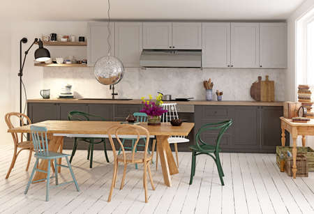 Interior of modern classic kitchen. Wooden dining table and chairs, green furniture, flowers and plants, crockery on the shelves, large window. Contemporary home design. 3D rendering.