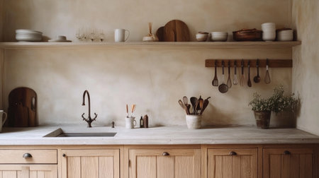Minimalist kitchen with concrete countertop, wooden cabinets and wall unit, neutral color palette, inspired by Scandinavian design, photographed from the front view, close-up of countertop and cabinet interior details, with ceramic cutlery on display in open shelves above the sink. --chaos 30 --ar 16:9 --v 6.1 Job ID: f74f1950-4080-4fc1-95a7-d50cb8d9acb0