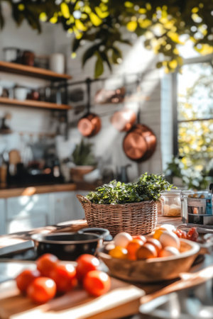 A beautifully arranged kitchen scene featuring a wooden countertop, cooking utensils, and fresh herbs bathed in natural light, creating a warm atmosphere.