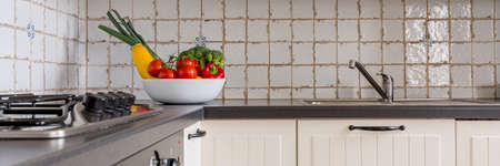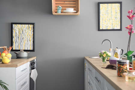 Counter with products and utensils in interior of modern kitchen