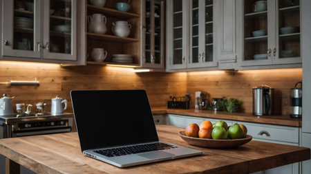 Open laptop with blank screen on a wooden desk in a kitchen room home office