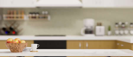 Modern dining table with a mug, apple bowl and copy space for product display over blurred kitchen in background. 3d rendering, 3d illustration