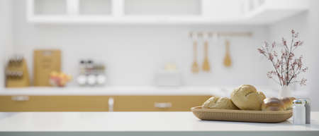 White kitchen tabletop with a bread basket, flowers vase and copy space for montage your product display over blurred minimal kitchen cooking space in background. 3d rendering, 3d illustration