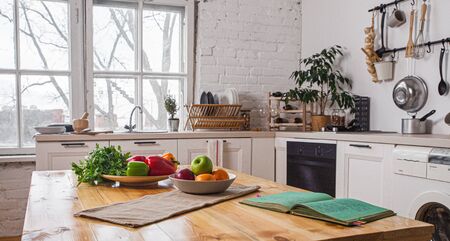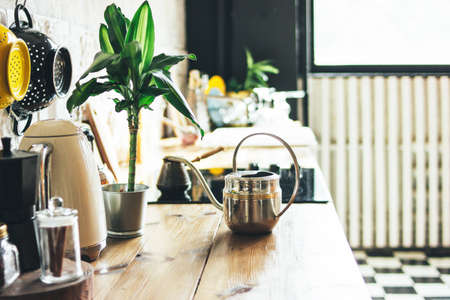 Kitchen work surface, the interior elements, Scandinavian rustic eco design with green plant