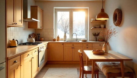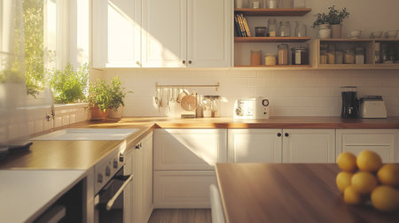 Cozy minimalist kitchen interior bathed in warm sunlight