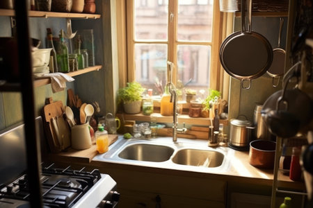 Cozy kitchen with retro decor and colorful utensils in sunlit room. That the image is generated using AI.