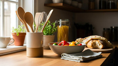 The image depicts a kitchen counter with various cooking utensils and ingredients. A wooden utensil holder contains spoons and a whisk, while a bowl of fresh fruits sits next to it. A jar of pasta and some potted herbs are also visible. The counter is neatly organized, suggesting a preparation for cooking or baking.