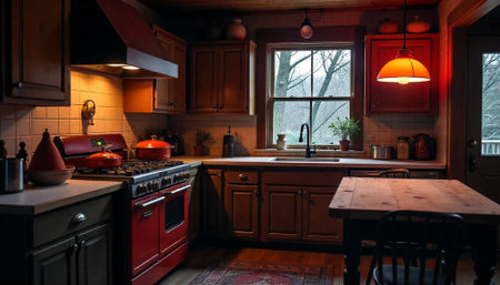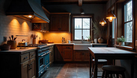 Cozy rustic kitchen interior with snow covered window view