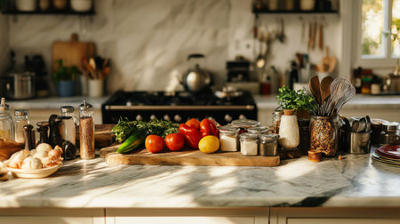 Modern kitchen with marble countertop and fresh produce, embracing a healthy lifestyle