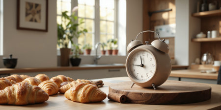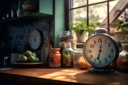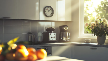 A modern kitchen with white cabinets, an electric clock on the wall, and fruit in front of it. The sun shines through the window into the room, creating a warm atmosphere. In one corner is a vase holding flowers. There's also a coffee machine next to the stove. This scene evokes feelings of comfort, happiness, and warmth. The image is cinematic, hyper-realistic, with daylight lighting, high-resolution photography, insanely detailed, and fine details against an isolated background. --ar 53:30 --v 6.1 Job ID: ffcec74d-baad-4677-b5b2-9d10a625abf1