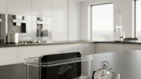 Red kitchen timer on white countertop releasing steam in warm domestic interior with soft natural light and minimalist composition.
