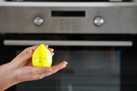 Woman holding kitchen timer in shape of lemon near oven, closeup. Space for text