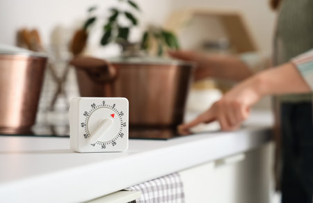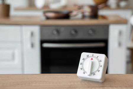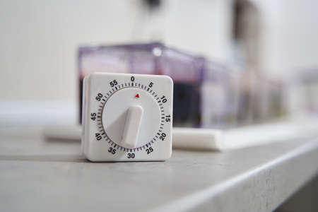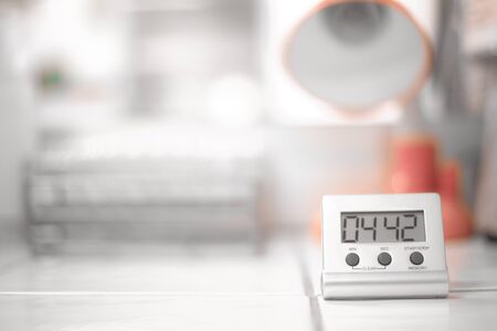 A cooking timer countdown on the white table in the asia modern kitchen shallow focus