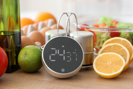Modern kitchen timer with food, salt and pepper shakers on table in room, closeup