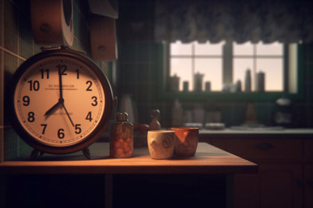Alarm clock and a cup of morning coffee with a coffee machine on the background of the kitchen interior.A glass of coffee on the table with a clock in the morning. Good morning concept. Generative AI