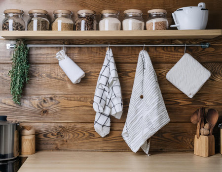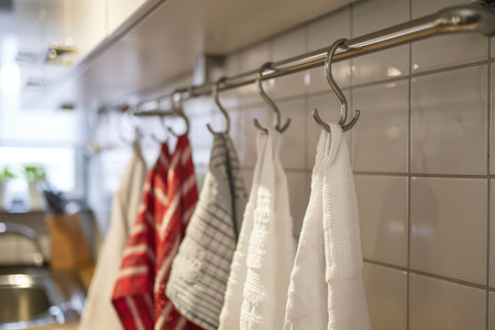 colorful dish towels hanging on a kitchen rack, created with generative ai