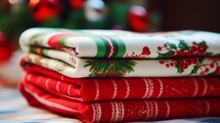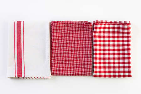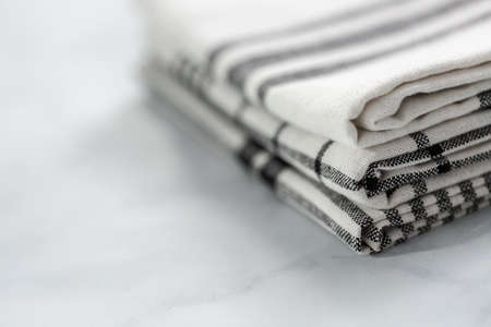 Clean kitchen textiles made of cotton and linen - napkins, towels folded on the table, horizontal, place for text